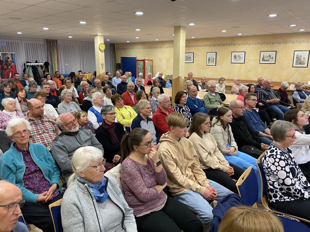 An diesem Sonntag war der Saal wieder bis auf den letzten Platz gefüllt. Wir haben uns gefreut viele gute Freunde zu treffen. Einige Missionsfreunde waren von weit her angereist, um unsere Mitarbeiterinnen zu treffen, um zu hören, wie es ihren Patenkindern oder unseren Mitarbeitern in der Ukraine geht, die sie unterstützen.