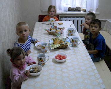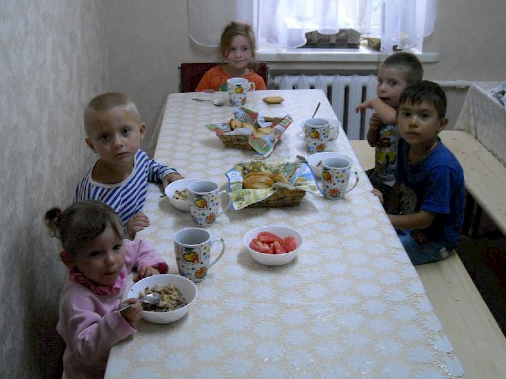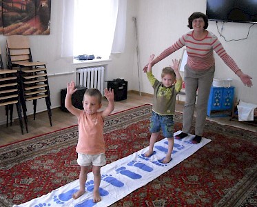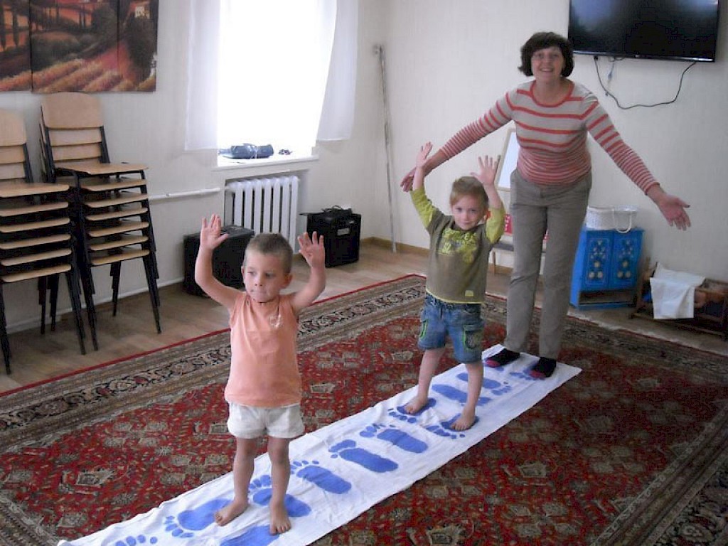 Unter der Anweisung von Lena Uchnal, die unsere ganze Kinderarbeit leitet, machen Wera Kolomoetz und Tanja Kononenko erste Schritte. In der Anfangszeit müssen sich unsere kleinen Gäste erst einmal an die neue Umgebung gewöhnen.