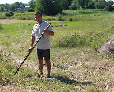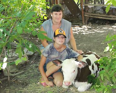 Familie Witjonowa plante, eine Kuh zu kaufen. Sie wollten Käse, saure Sahne, Butter und Joghurt aus der Milch herstellen. Doch dann kam der Krieg. Dima wurde arbeitslos, Anja hatte eine Operation und die geringen Ersparnisse waren schnell aufgebraucht. Wir haben beschlossen, der Familie zu helfen und haben ihnen zwei Milchkälber gekauft. Milka und Dunja sind die Lieblinge der Familie. Tochter Nastja versorgt sie mit Wasser. Dima macht Heu für den Winter. Tagsüber verstecken sich die Kälbchen vor der Sonne unter den Bäumen im Garten.