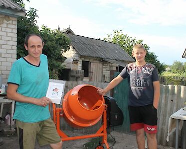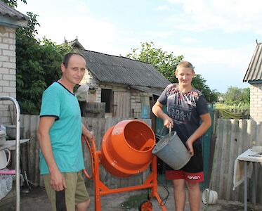 Gemeinsam mit der Familie überlegten wir, wie wir helfen können. Roma ist Bauarbeiter und könnte kleinere Bauarbeiten ausführen. Er hat jedoch kaum Werkzeug. Wir kauften für Familie Kriwarutschko einen Betonmischer. Roma freute sich riesig! „Vielen, vielen Dank! Viele Menschen benötigen im Krieg einen sicheren Schutzraum oder wollen einen bestehenden Raum verstärken. Mit dem Betonmischer kann ich den Menschen helfen und nebenbei etwas Geld verdienen.“