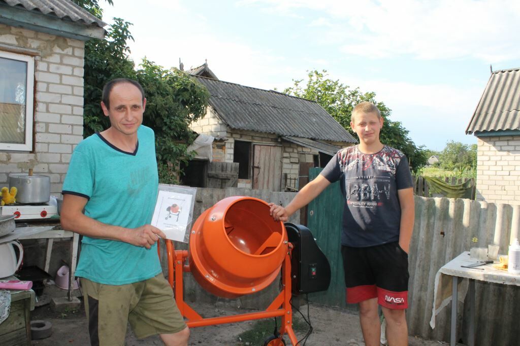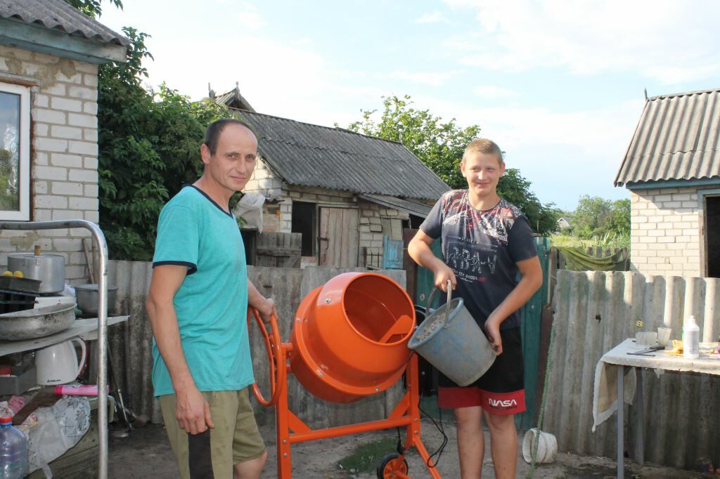 Gemeinsam mit der Familie überlegten wir, wie wir helfen können. Roma ist Bauarbeiter und könnte kleinere Bauarbeiten ausführen. Er hat jedoch kaum Werkzeug. Wir kauften für Familie Kriwarutschko einen Betonmischer. Roma freute sich riesig! „Vielen, vielen Dank! Viele Menschen benötigen im Krieg einen sicheren Schutzraum oder wollen einen bestehenden Raum verstärken. Mit dem Betonmischer kann ich den Menschen helfen und nebenbei etwas Geld verdienen.“