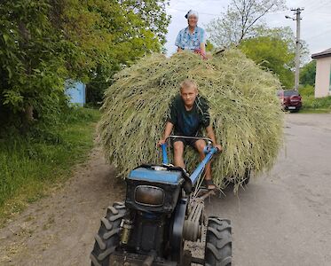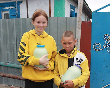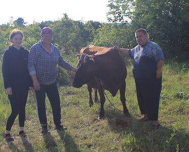 Dank unseres Starthilfe-Projektes haben einige Familien eine Kuh von uns erhalten, eine Kuh als Ernährer. Sie liefert Milch, saure Sahne, Käse, Butter und Kefir. Die Familien haben auch die Möglichkeit, Milchprodukte zu verkaufen und damit Geld zu verdienen. Die Menschen bemühen sich, Futter für die Kühe anzubauen. In ihren Gärten haben sie Kartoffeln gepflanzt, Heu ernten sie für den Winter.
