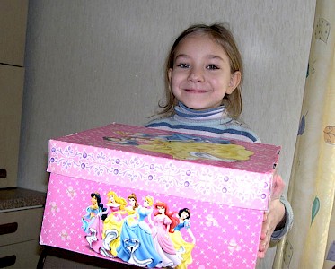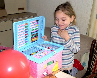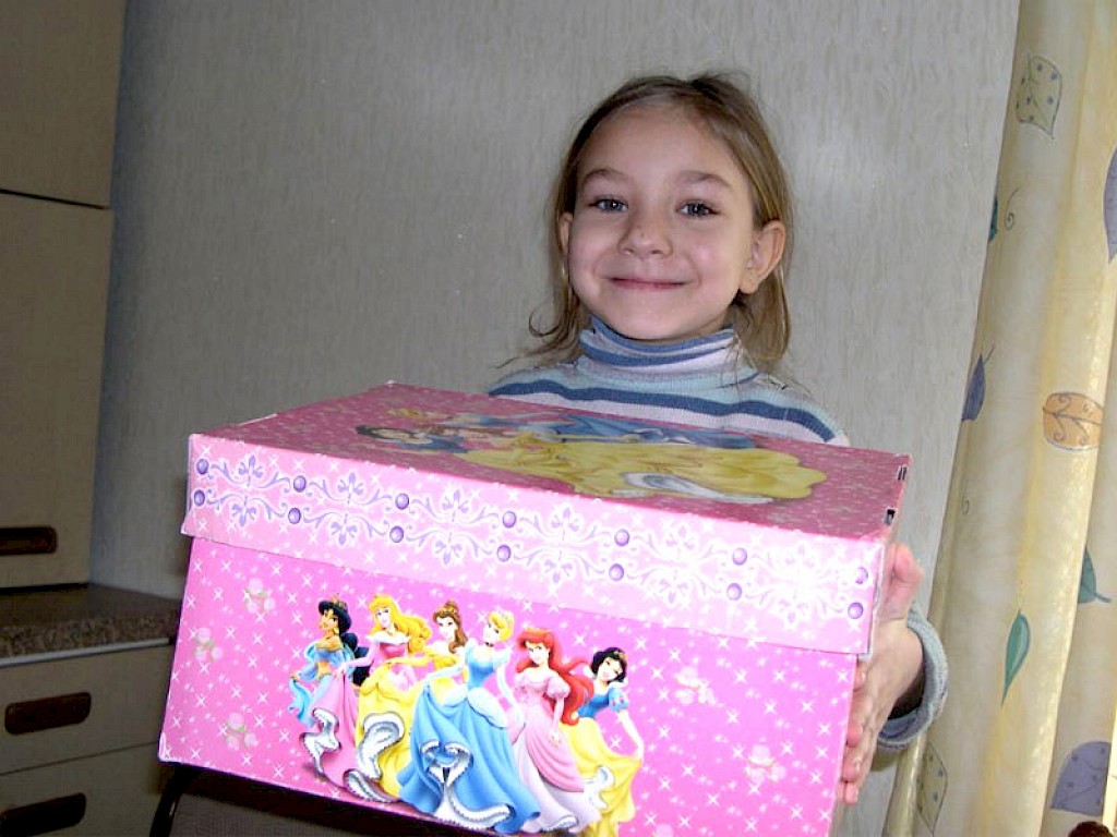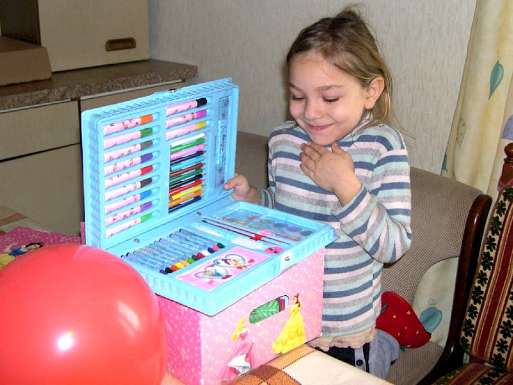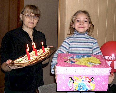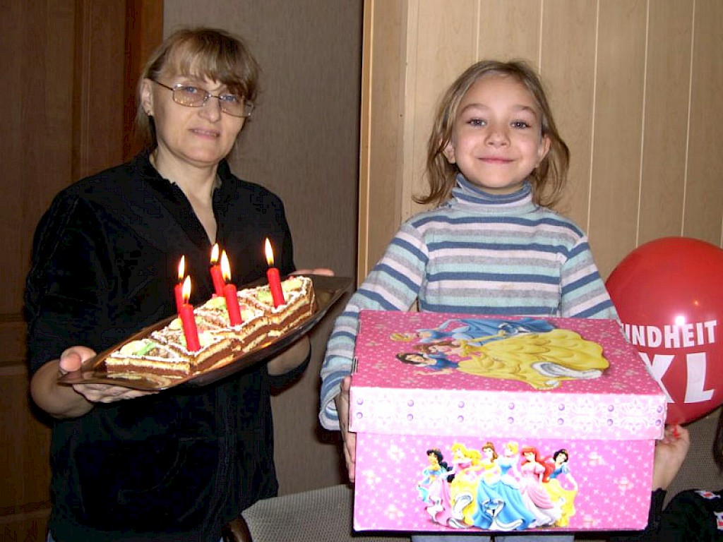 Feierlich trägt Oxana Lebed den Geburtstagkuchen in die Küche und Wera Beresniuk überreicht ihr ein riesiges Geburtstagspaket. Mit zitternden Fingern packt sie aus, eine süße Puppe, duftendes Duschgel, bunte Haarspangen und vieles mehr.