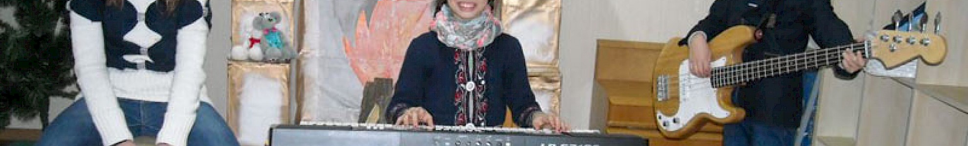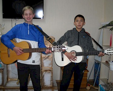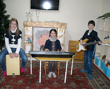 Wir versuchen unsere Jungen und Mädchen aber auch musikalisch zu fördern. In unserem „Zufluchtsort“ in Odarjewka haben wir eine Musikgruppe ins Leben gerufen, die uns in unseren Kinderstunden bei allen Liedern begleitet. Wir sind froh, dass uns aus Deutschland gute Musikinstrumente geschickt wurden.