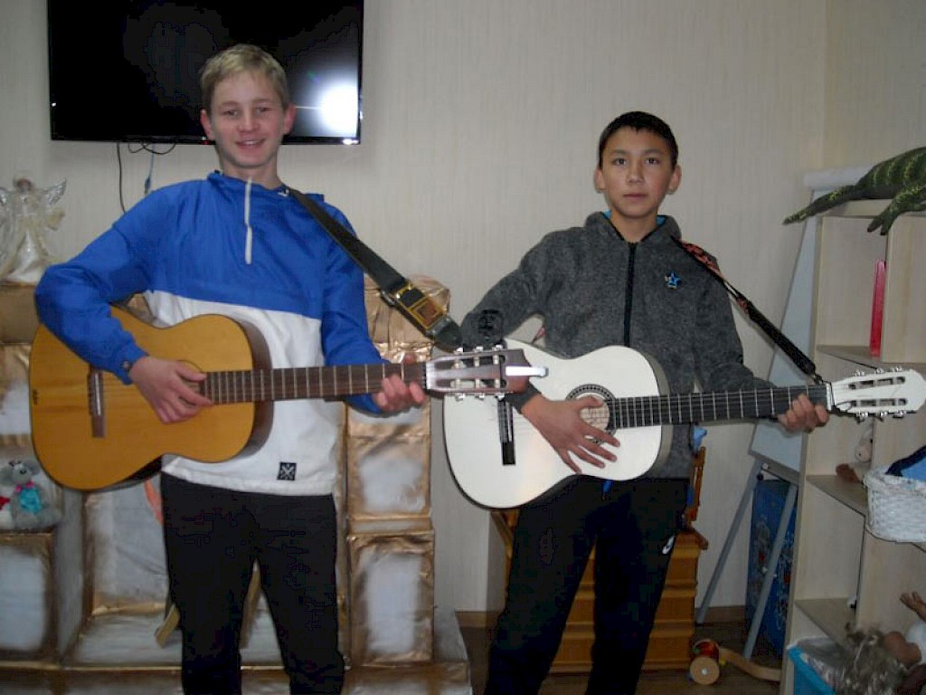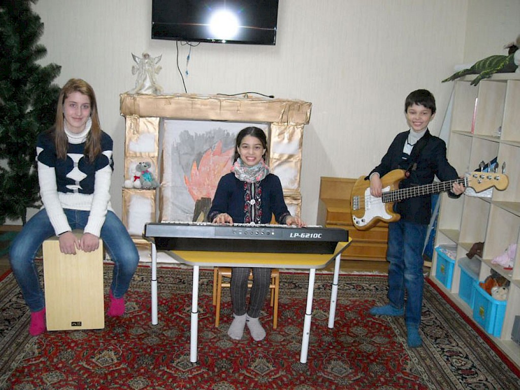 Wir versuchen unsere Jungen und Mädchen aber auch musikalisch zu fördern. In unserem „Zufluchtsort“ in Odarjewka haben wir eine Musikgruppe ins Leben gerufen, die uns in unseren Kinderstunden bei allen Liedern begleitet. Wir sind froh, dass uns aus Deutschland gute Musikinstrumente geschickt wurden.