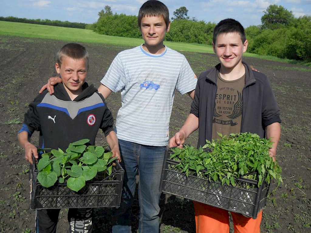 Luda Slobodianik hat in ihren großen Gewächshäusern Hunderte von Gemüsepflanzen gezüchtet, die sie an dem Tag nach Schorsk gebracht hat. Im nächsten Augenblick stehen die Teenager auch schon neben uns und helfen. Sie sind mit dieser Arbeit vertraut, weil sie zu Hause auch im Garten helfen müssen.