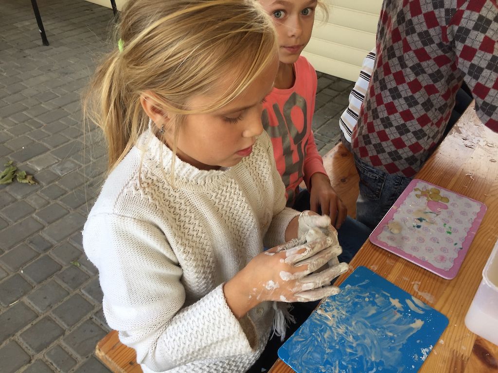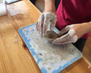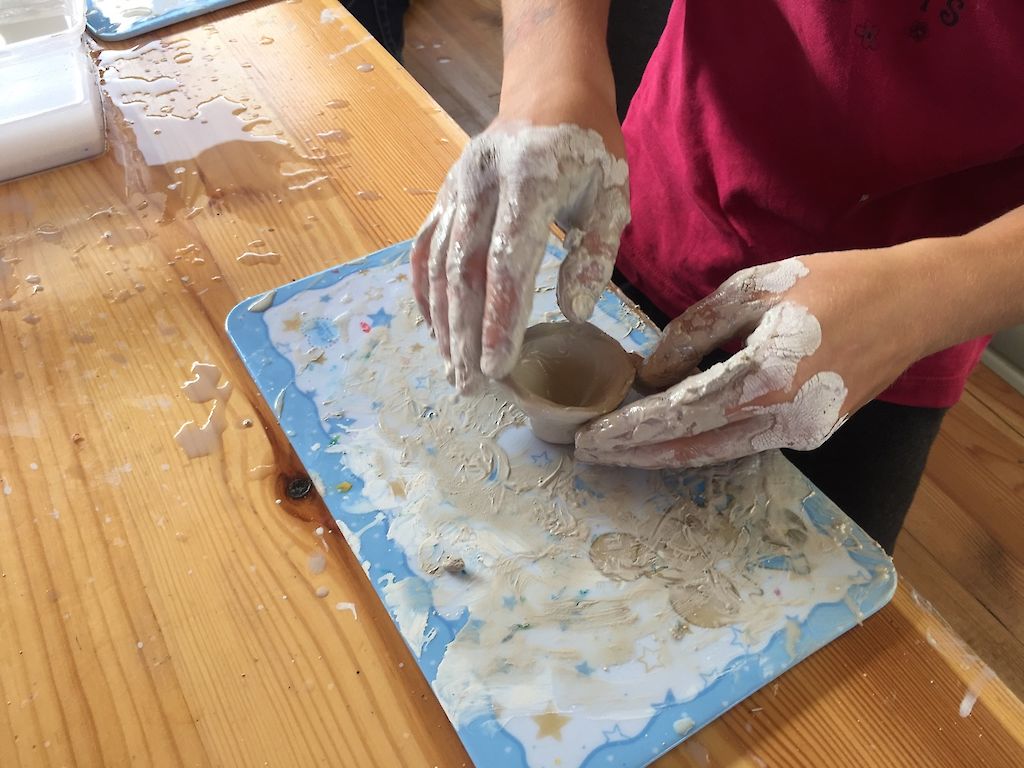 Nun wollten sich unsere Mädchen und Jungen selbst als Töpfer beweisen. Ganz vorsichtig machten sie sich an die Arbeit, überlegt, was sie noch vom Töpfer behalten hatten. Langsam nahmen ihre Gefäße Form an. Am Ende schrieben sie ihre Namen auf den Ton.