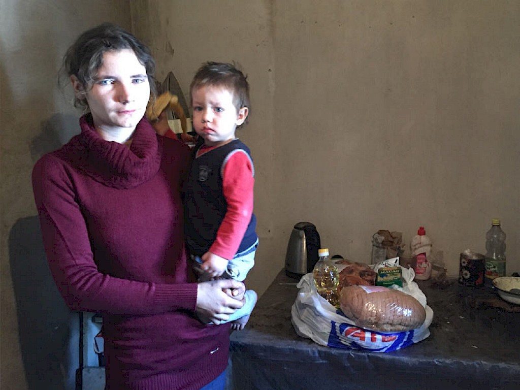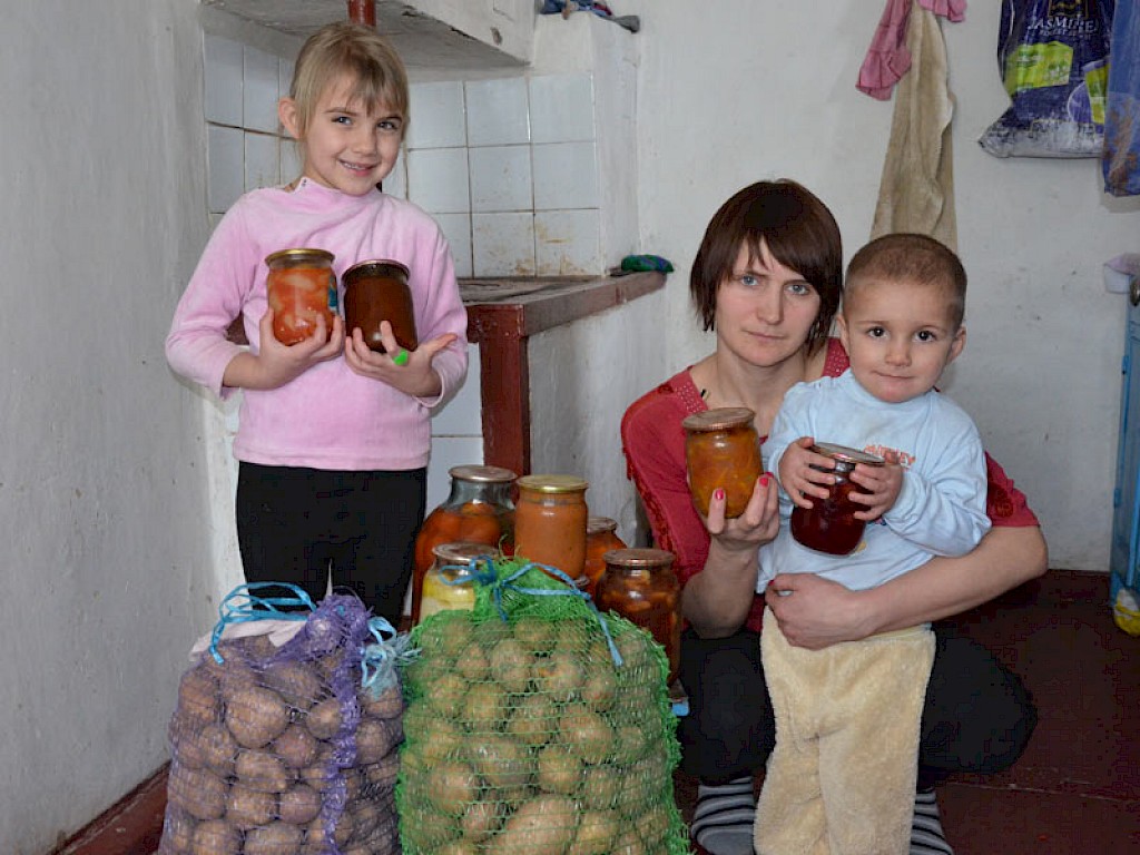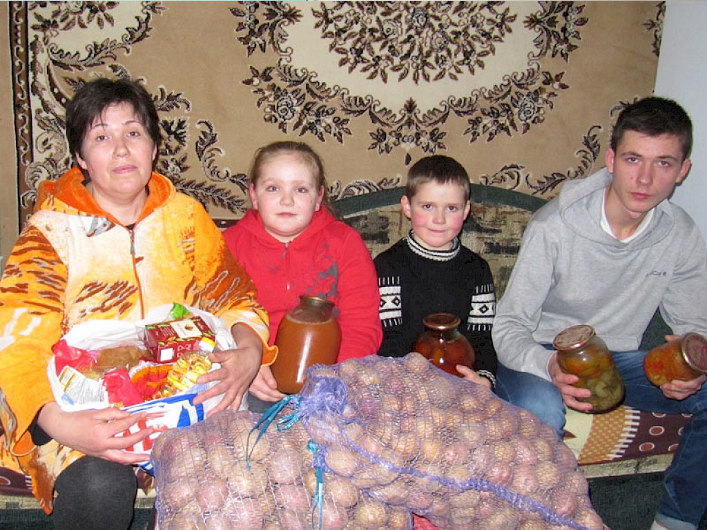 „…hallo Luda…es tut mir Leid, aber…aber unser Lift funktioniert schon lange nicht mehr…aber…aber wir kommen runter, um dir zu helfen…“ Wenig später steht Luda Slobodianik vor einem Hochhaus in Swetlowodsk, mit einigen kleinen Helfern. Irinas Sohn schleppt einen schweren Kartoffelsack, die kleine Schwester Gemüse, der 6jährige Kostja Einweckgläser.