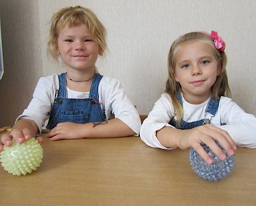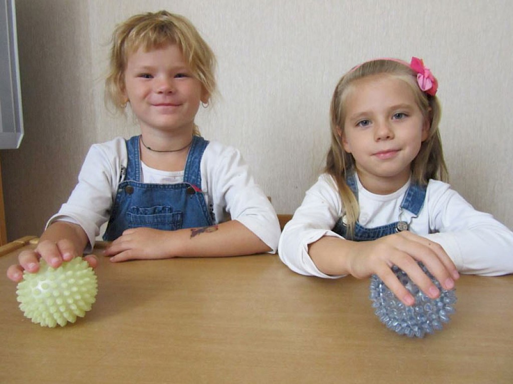 Lustige Gymnastikbälle sollen ihre Finger stärken. Und in der Zwischenzeit machen die meisten unserer kleinen Freunde ihre Übungen nicht nur bei uns, sondern auch zu Hause.