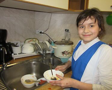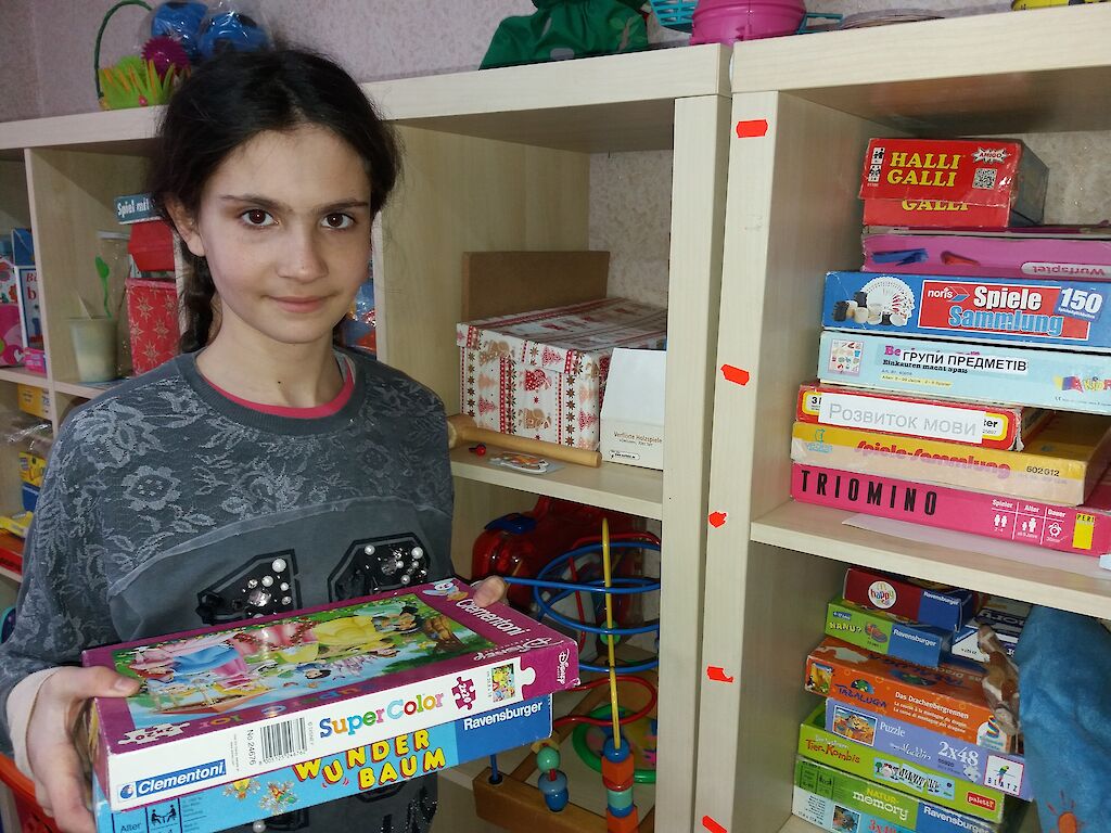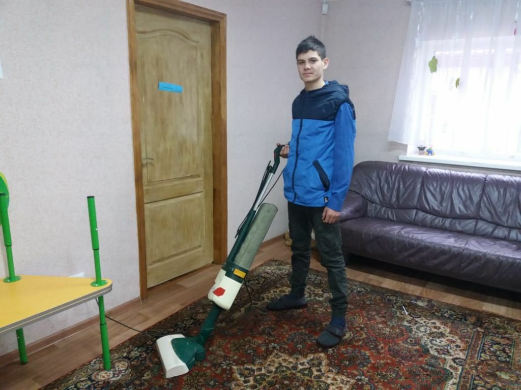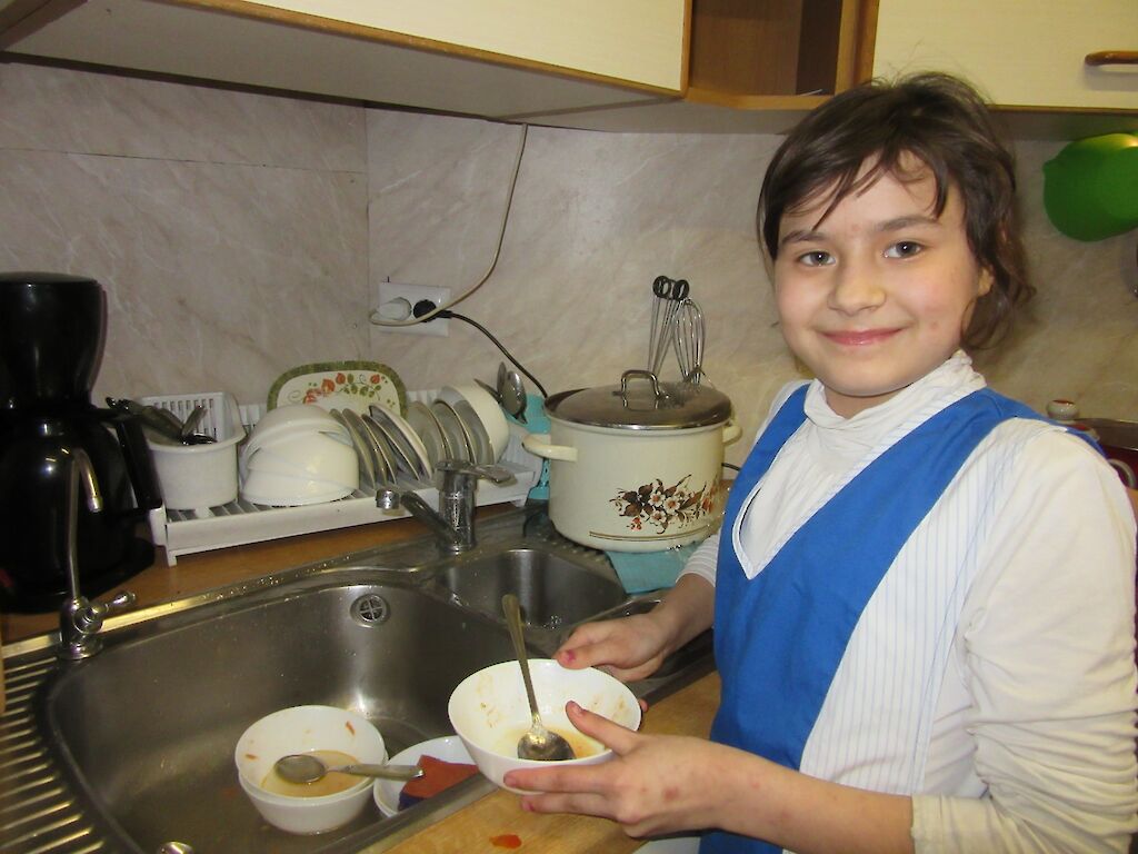 In unserem „Zufluchtsort“ in Boschedarjewka helfen die Teenager gerne mit. Aus dem Wasserhahn fließt warmes Wasser. Wir haben eine Waschmaschine, einen Staubsauger, ein Bügeleisen, ein Kühlschrank, einen Herd, eine Dusche und vieles mehr. Das sind alles Dinge, die unsere Gäste erst bei uns kennengelernt haben.