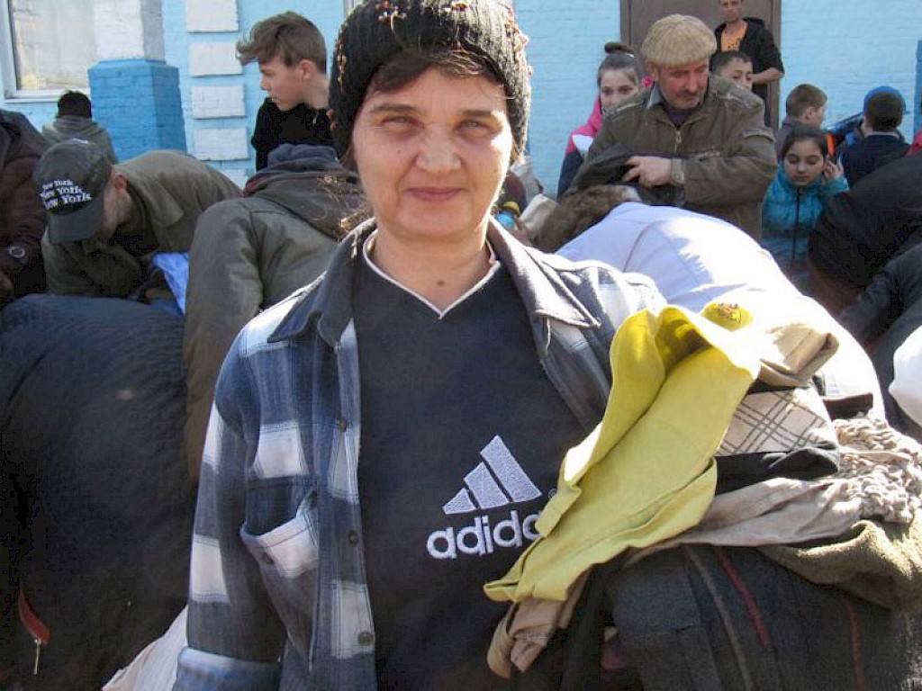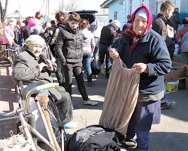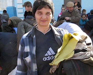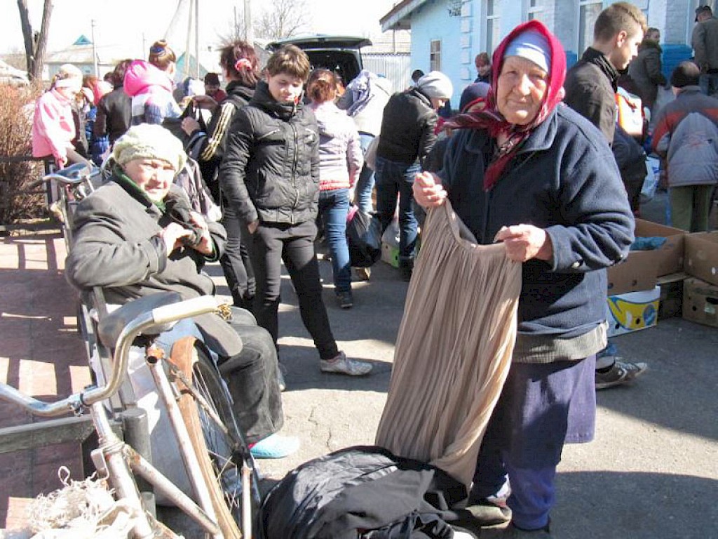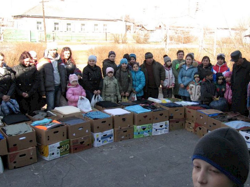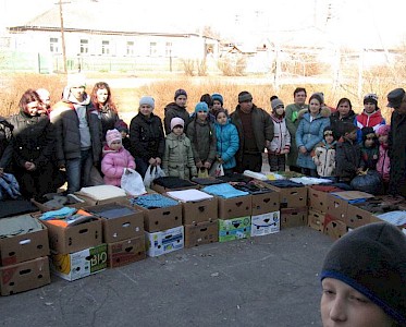 Heute ist ein ganz besonderer Tag in Pawlowka. Wir haben ganz arme Familien eingeladen, die wir mit Hilfsgütern aus Deutschland beschenken wollen. Da kommen alte Menschen, Mütter mit kleinen Kindern, behinderte Menschen im Rollstuhl.