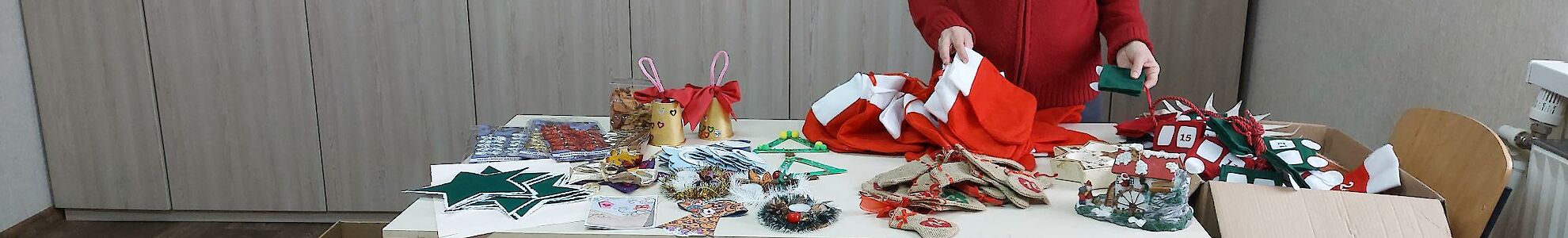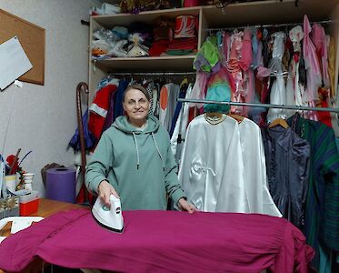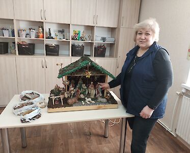Lena Grabenko, die unsere Nähwerkstatt leitet, putzt die Figuren aus unseren Krippen. Sie näht in diesem Jahr Weihnachtskostüme für unseren Kinderchor. Im letzten Jahr hatten sie nur einen Auftritt. Da haben wir die Kostüme aus einer Gemeinde geliehen. Nun werden wir mehrere Auftritte haben.