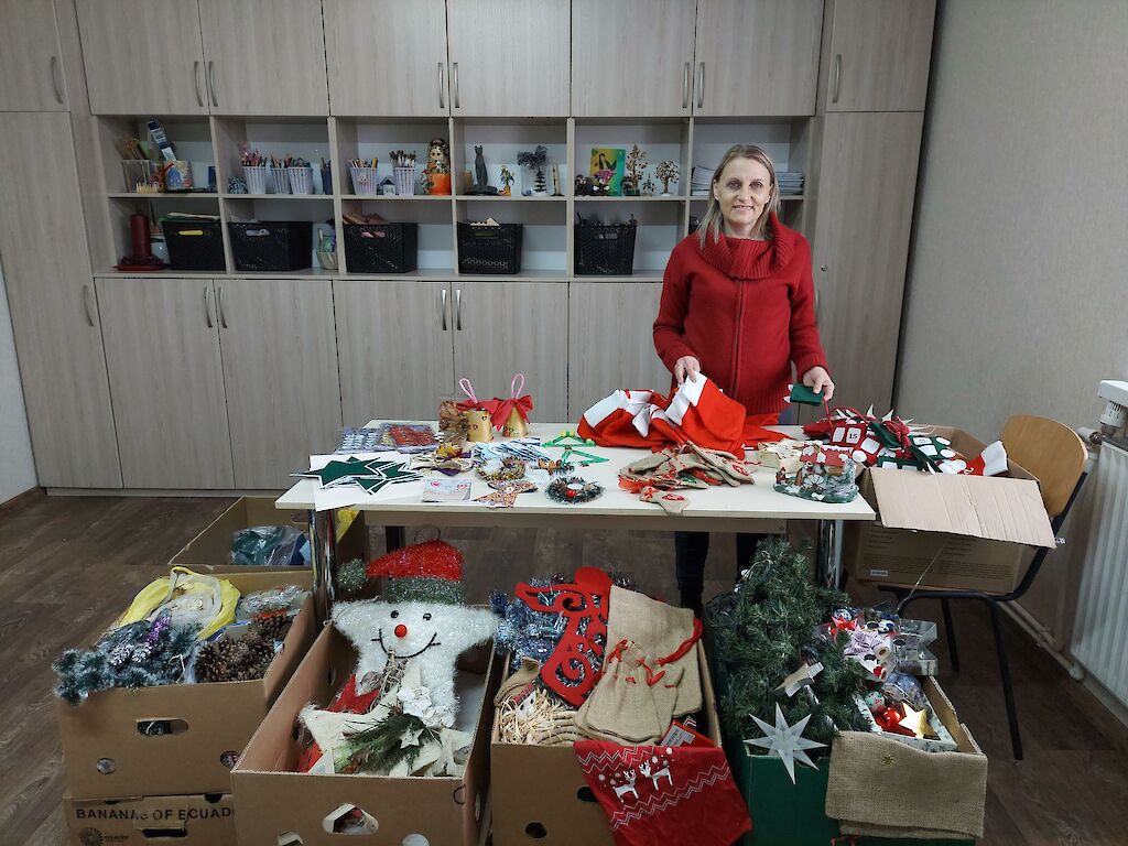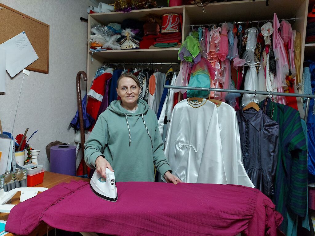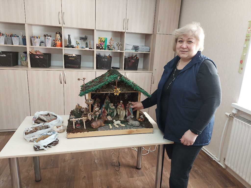 Lena Grabenko, die unsere Nähwerkstatt leitet, putzt die Figuren aus unseren Krippen. Sie näht in diesem Jahr Weihnachtskostüme für unseren Kinderchor. Im letzten Jahr hatten sie nur einen Auftritt. Da haben wir die Kostüme aus einer Gemeinde geliehen. Nun werden wir mehrere Auftritte haben.