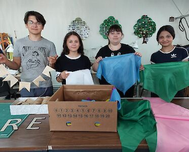 Natürlich laufen die Vorbereitungen bereits auf Hochtouren. In unserer Lehrwerkstatt nähen wir Tücher für die verschiedenen Teams und bunter Fahnen. Besonders wichtig ist die Bühnendekoration.