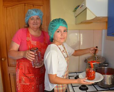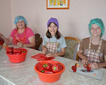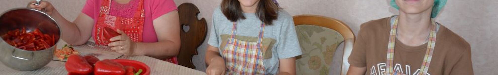 „Tante Anja, schau mal, ich habe die ganzen Paprika klein geschnitten. Was machen wir denn jetzt damit?“ Dascha und die anderen Mädchen im Tageskinderheim am See lernen, wie man Obst und Gemüse einmacht. „Das Traubenkompott schmeckt bestimmt köstlich!“, Raja füllt eifrig die reifen Beeren in Gläser. Gerade während des Krieges ist es wichtig, Vorräte anzulegen. Es ist ungewiss, wie die Versorgung mit Lebensmitteln im Winter aussehen wird. Ob man alles kaufen kann?
