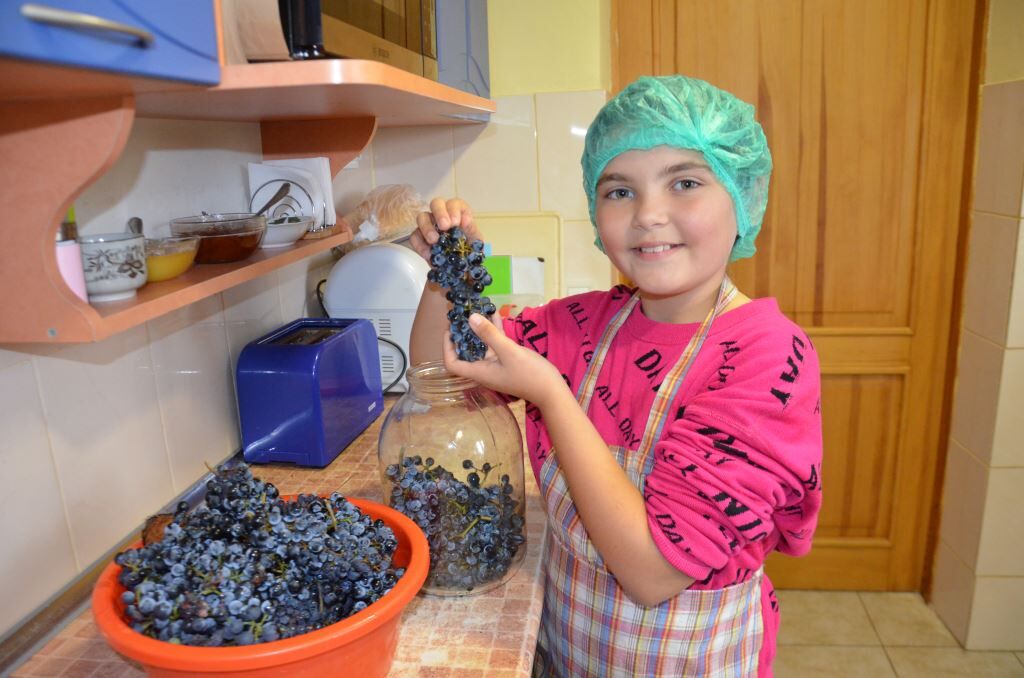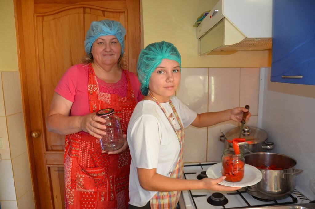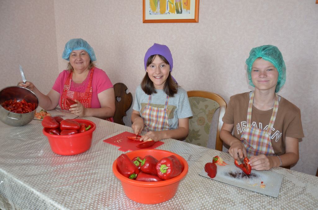 „Tante Anja, schau mal, ich habe die ganzen Paprika klein geschnitten. Was machen wir denn jetzt damit?“ Dascha und die anderen Mädchen im Tageskinderheim am See lernen, wie man Obst und Gemüse einmacht. „Das Traubenkompott schmeckt bestimmt köstlich!“, Raja füllt eifrig die reifen Beeren in Gläser. Gerade während des Krieges ist es wichtig, Vorräte anzulegen. Es ist ungewiss, wie die Versorgung mit Lebensmitteln im Winter aussehen wird. Ob man alles kaufen kann?