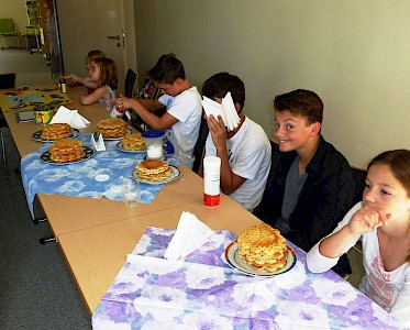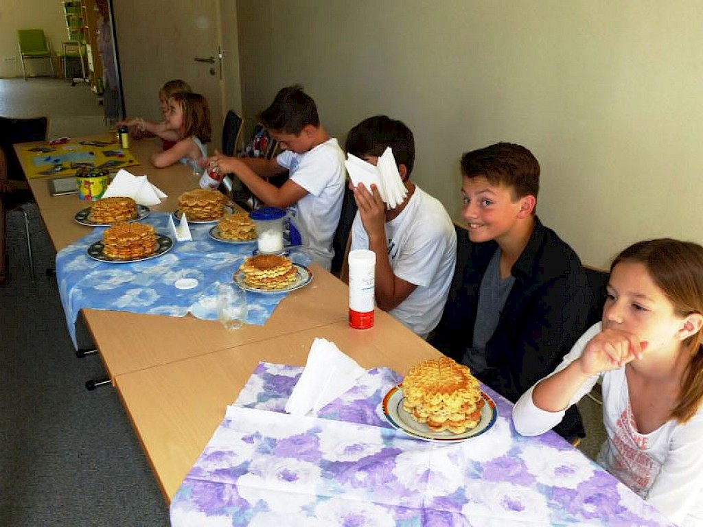 Zum Ferienbeginn hat sich der „Bibelentdeckerclub“ der EFG Waldsolms-Kröffelbach eine Aktion ausgedacht, um zusätzliches Geld für Roman zu sammeln: zehn Kids und vier Mitarbeiter backten ca. 100 Waffeln und boten sie gegen eine freiwillige Spende nach dem Gottesdienst an. Der Bibelentdeckerclub ist dankbar, auf diese Weise fast 200 Euro in seine Spardosen bekommen zu haben.