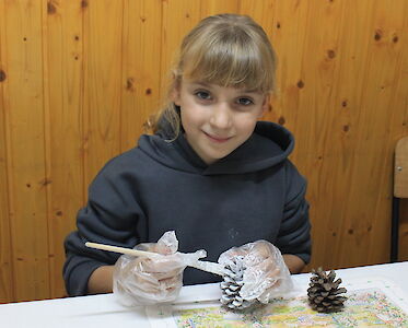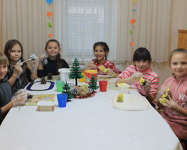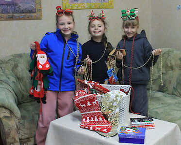 Während des Gesprächs bemalen einige Kinder Tannenzapfen und Nüsse für Weihnachtsdekorationen, andere sortieren die Kartons mit dem Weihnachtsschmuck. Sie verkleiden sich mit Perlen und probieren die zauberhaften Nikolausmützen aus. Alle haben viel Spaß! Unsere Erzieherinnen haben interessante biblische Geschichten, Spiele und Bastelarbeiten vorbereitet.