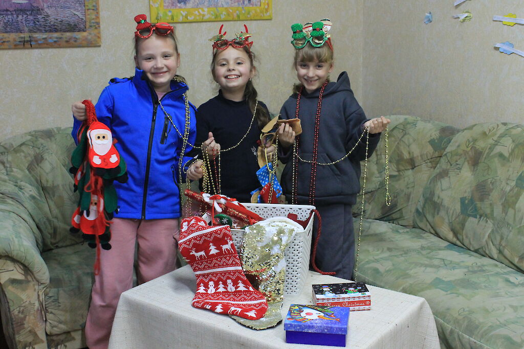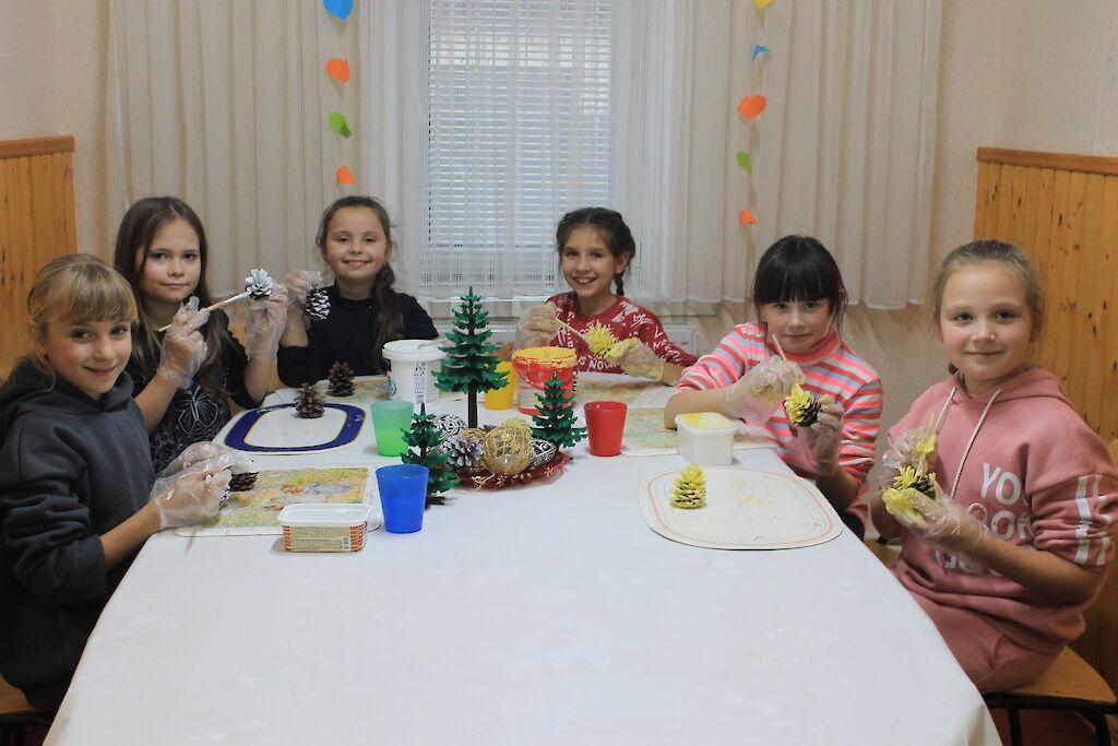 Während des Gesprächs bemalen einige Kinder Tannenzapfen und Nüsse für Weihnachtsdekorationen, andere sortieren die Kartons mit dem Weihnachtsschmuck. Sie verkleiden sich mit Perlen und probieren die zauberhaften Nikolausmützen aus. Alle haben viel Spaß! Unsere Erzieherinnen haben interessante biblische Geschichten, Spiele und Bastelarbeiten vorbereitet.