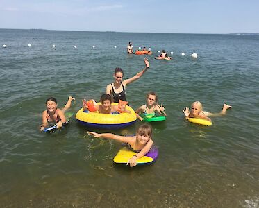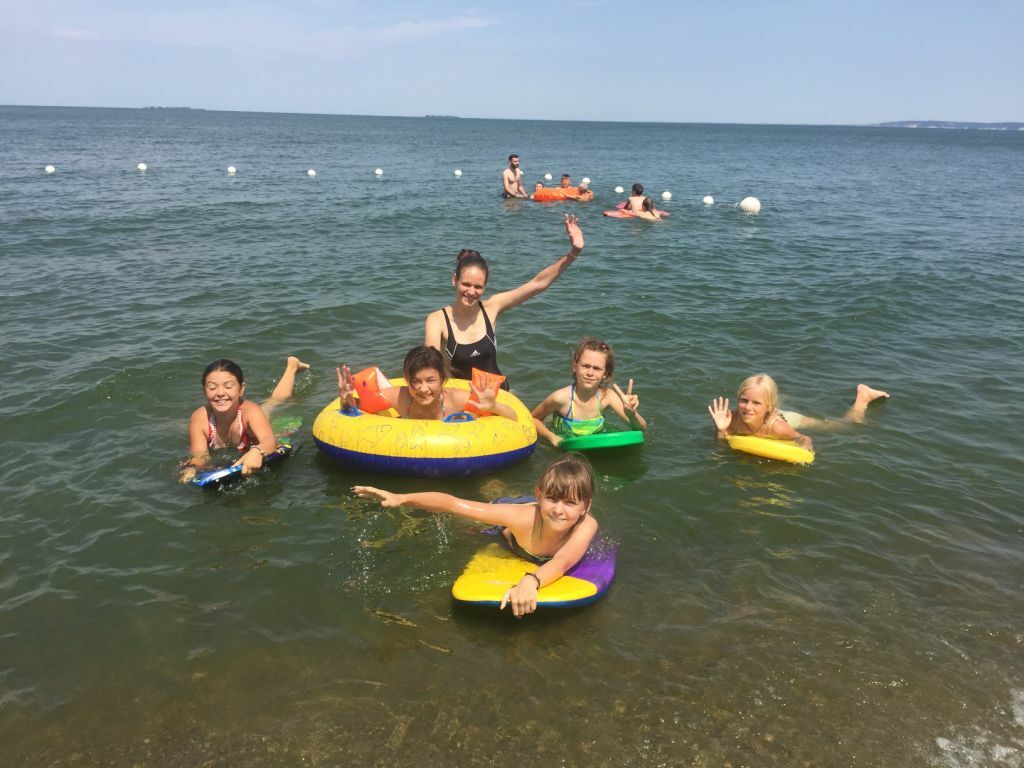 Heute haben wir wunderbares Wetter, nicht kalt, aber auch nicht zu heiß. Da hüpfen wir auf dem Trampolin, schwimmen im Fluss, basteln in verschiedenen Gruppen oder gehen mit unseren neuen Freunden am Ufer des Flusses spazieren.