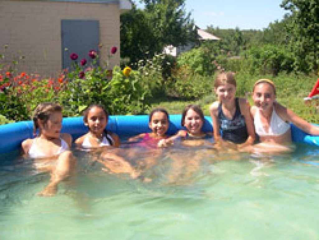 Auch im Sommer besuchen viele Jungen und Mädchen unsere Kinderhäuser, denn wo wird ihnen sonst ein so abwechslungsreiches Programm geboten, wie bei uns. Unsere Köchinnen zaubern jeden Tag leckeres Essen auf den Tisch, in diesen Monaten natürlich besonders aus Gemüse und Früchten. Doch der Höhepunkt ist unser großer aufblasbarer Swimming Pool im Garten von „Villa am See“. Da in den vergangenen Wochen das Thermometer in Swetlowodsk nie unter 30 Grad gefallen ist, freuen sich alle riesig auf die wunderbare Erfrischung. Nach dem Bad im kühlen Nass genießen wir gemeinsam einen Fruchtsaft und bevor die Kinder nach Hause gehen, lesen wir ihnen noch eine biblische Geschichte vor.