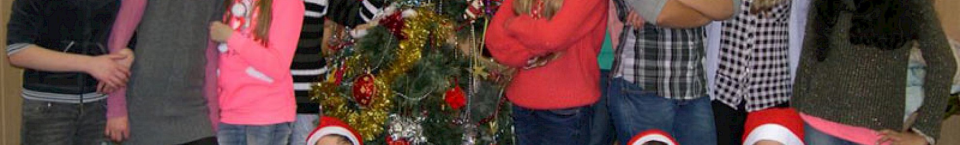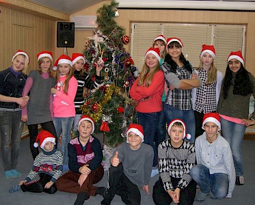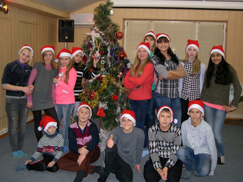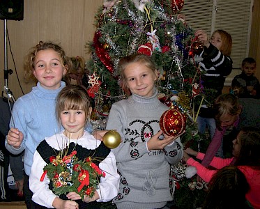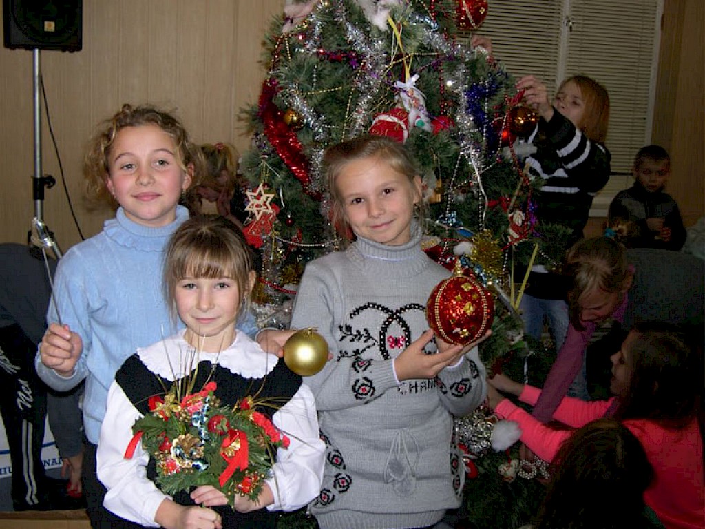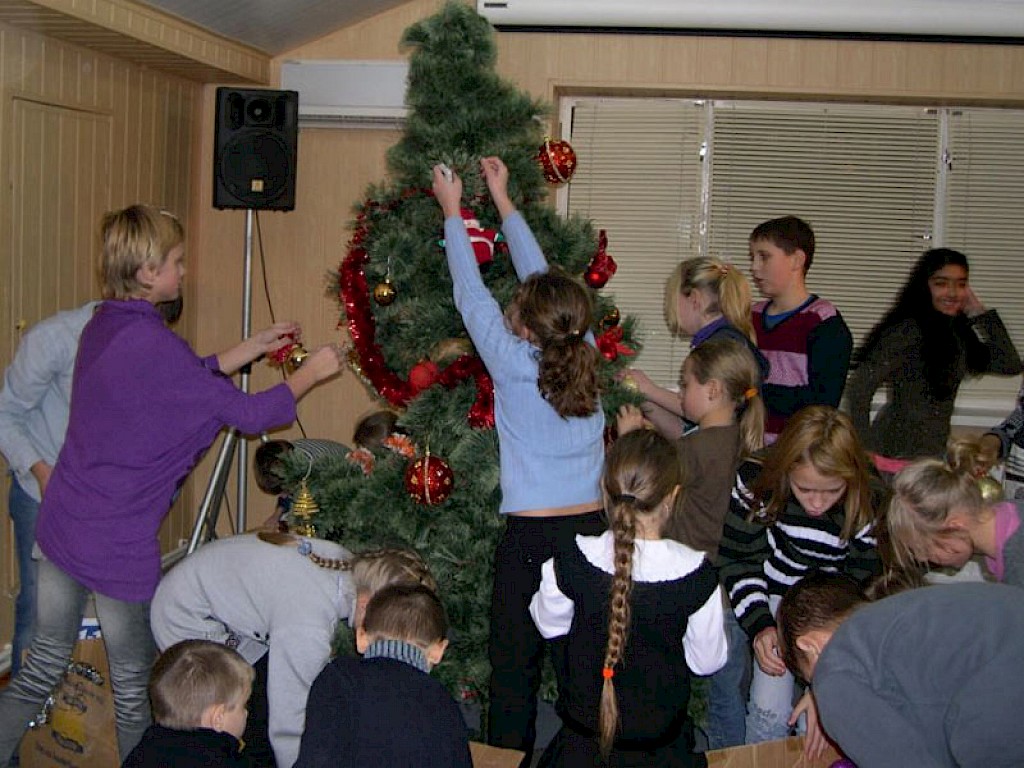 Neben dem Baum stehen Kartons, die nun sorgfältig geöffnet werden. Jarik zieht vorsichtig eine Girlande aus einem Karton. Wowa reicht uns die Weihnachtsbaumkugeln. Oxana Lebed hat in der Zwischenzeit eine CD mit festlicher Weihnachtsmusik aufgelegt. Eine Mädchen seufzt: „Weihnachten ist die schönste Zeit im Jahr!“