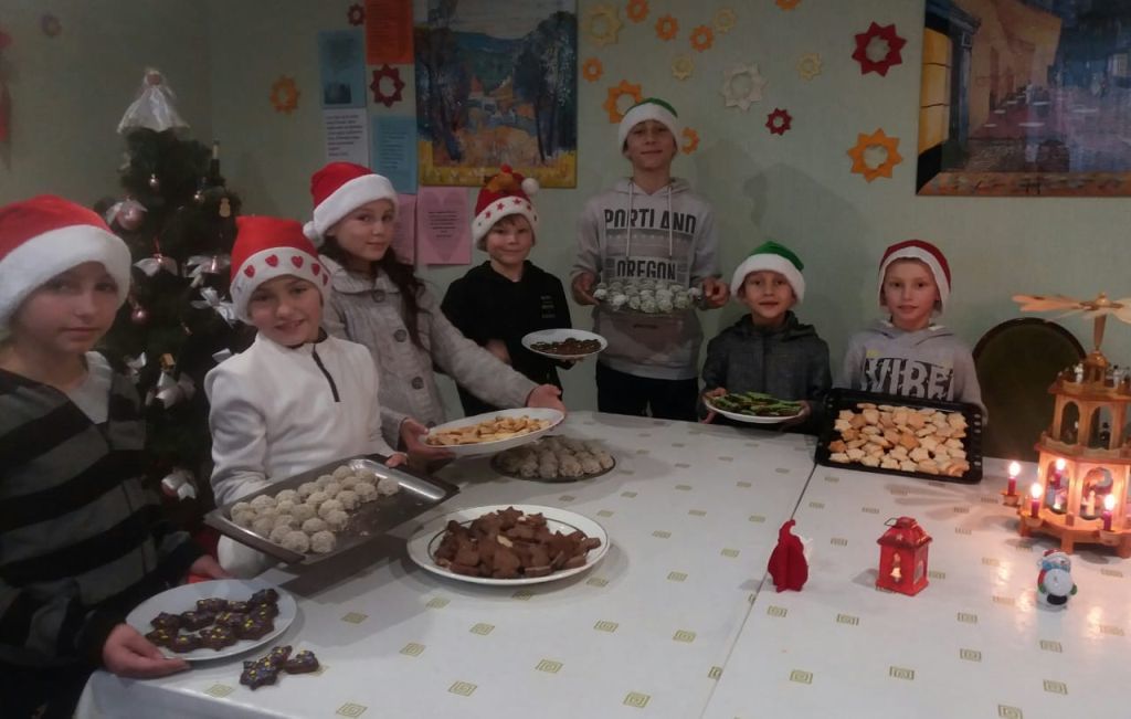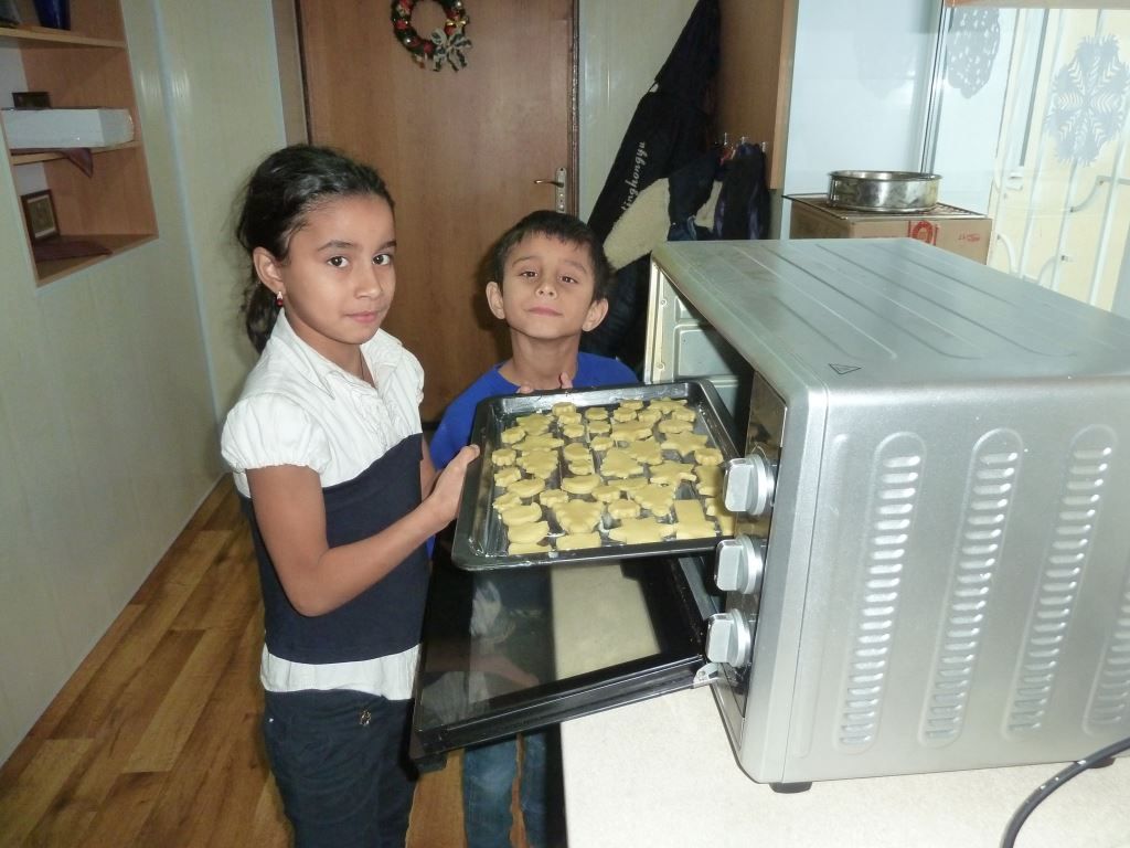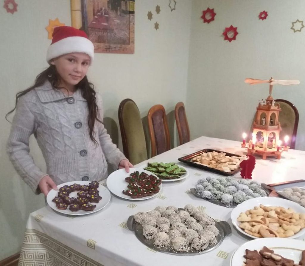 Und wir backen aber auch Weihnachtskekse. Wir nehmen sie bei unseren Besuchen bei alten Menschen und Kranken mit, um sie damit zu beschenken.