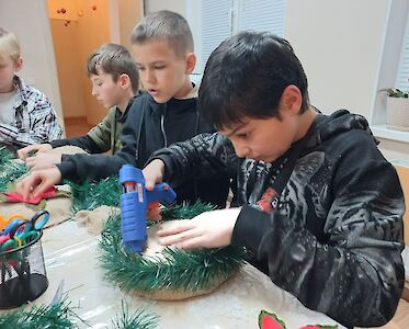 Mit Beginn der Adventszeit dürfen die großen Kinder, die die Schule im Sommer beenden werden und zum letzten Mal mit uns zusammen Weihnachten feiern, den Kranz an der Tür anbringen. In „Villa Sonnenschein“ freute sich Dima über diese Aufgabe. Aber auch alle anderen Kinder gestalteten ihren Weihnachtskranz für zuhause. So werden ihre Familien daran erinnert, dass wir bald die Geburt von Jesus feiern werden.