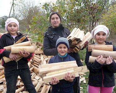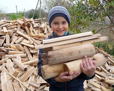 Ganz stolz trägt die Mutter erstes Holz in ihre Hütte. Schon bald knistert der Ofen und verbreitet eine gemütliche Wärme. Familie Iwantschenko dankt allen Missionsfreunden in Deutschland, die sie mit Brennholz für den Winter beschenkt haben.