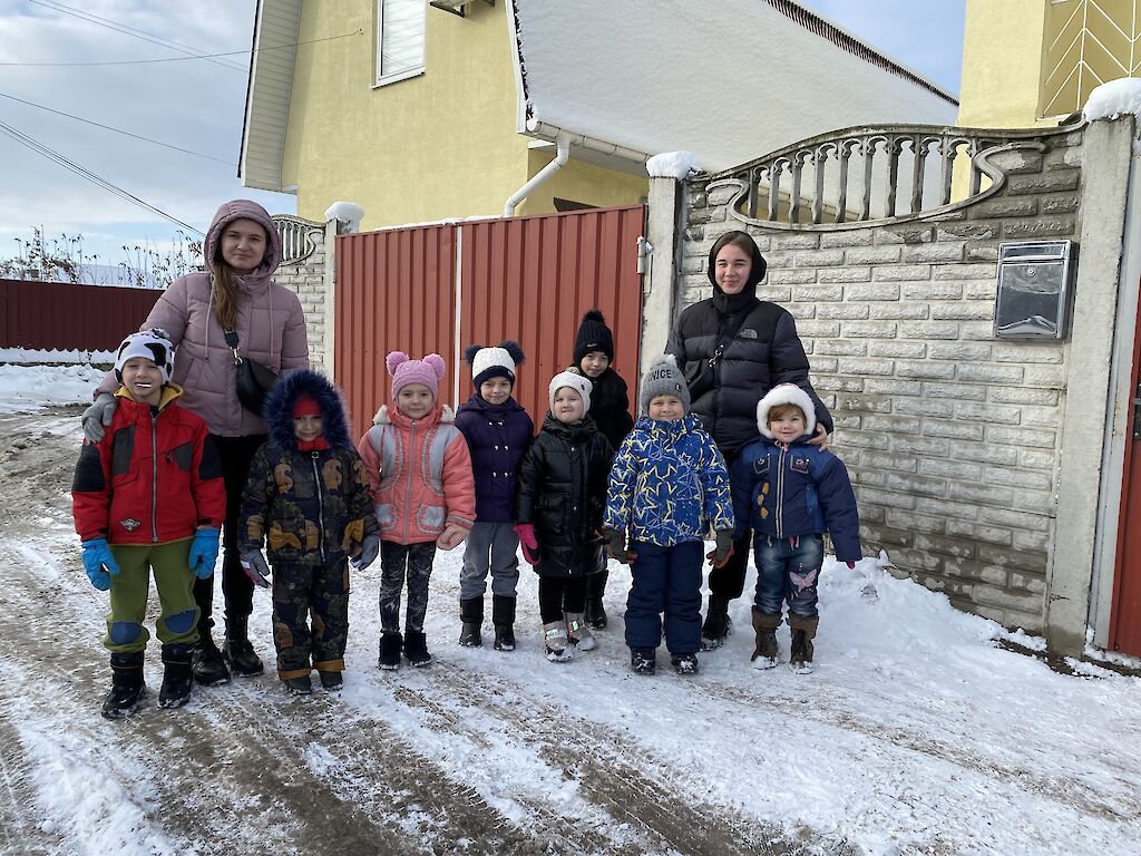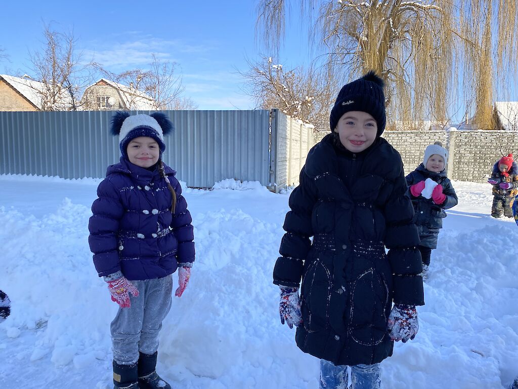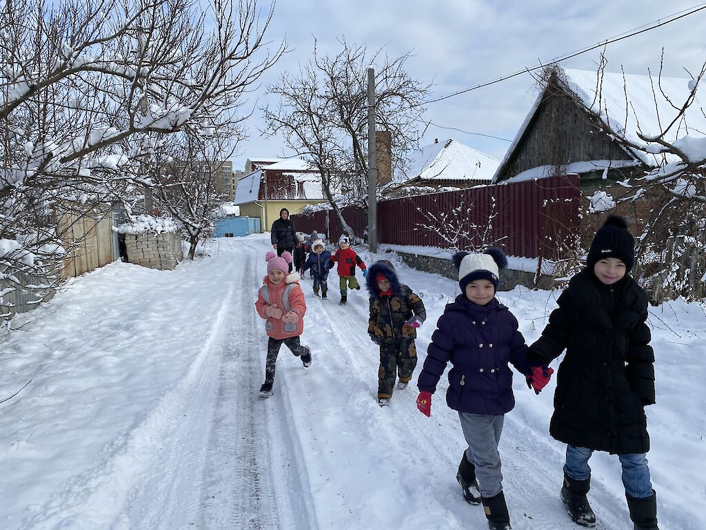 Was gibt es schöneres als Schnee für unsere Kleinsten aus dem „Spatzennest“. Sobald es draußen schneit, können sie es nicht abwarten mit Schneebällen zu spielen, Schlitten zu fahren und Schneemänner zu bauen. Trotz dem schrecklichen Krieg tun wir alles, damit sich unsere Kinder sicher fühlen und Spaß haben. Die Freude war riesig, als wir uns an einem kalten Vormittag alle warm anzogen, um im Schnee zu spielen. Anschließend, auf einer Winterwanderung, konnten sich alle so richtig austoben. „Schau mal, da sitzt ein kleines Vögelchen auf dem Baum. Tante Lisa, meinst du, es friert?“, ruft Dascha besorgt.