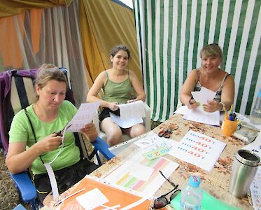Am späten Nachmittag fangen wir an, über unser Programm nachzudenken. Da wird die Bühne aufgebaut, Lieder vom Musikteam eingeübt, Anspiele geprobt.